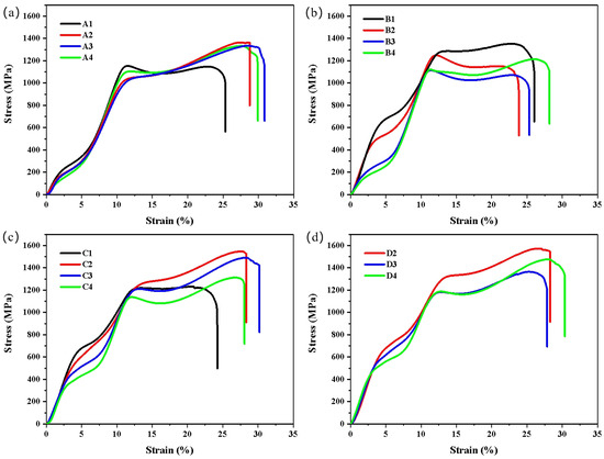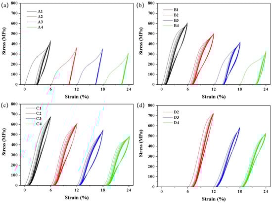 Compression stress–strain curves of NiTi samples: (a) A1–A4, (b) B1–B4, (c) C1–C4, and (d) D2–D4.