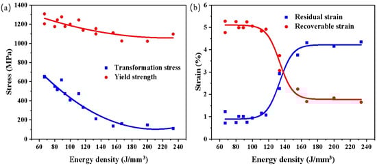 (a) Transformation stress and yield strength versus energy density. (b) Recoverable strain and residual strain versus energy density.