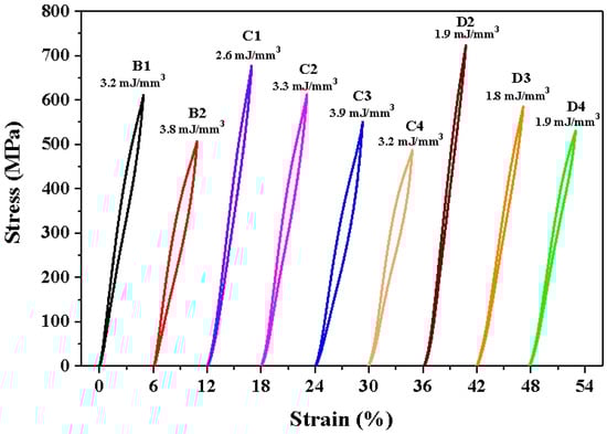Moreover, in order to facilitate a comparative analysis of the superelasticity of different NiTi samples, the changes in residual strain and recovery strain with energy density after 10 cycles are calculated and presented in Figure 5b. It can be observed that the recoverable strain is less than 1.8% when the energy density is within the range of 166.7 to 233.3 J/mm3. As the energy density decreases, the recoverable strain of the sample increases gradually. At an energy density of 66.7 to 116.7 J/mm3, the recoverable strain is observed to be essentially stable at approximately 5.0%. Furthermore, the samples with an energy density of 66.7–116.7 J/mm3 (B1, B2, C1–C4, D2–D4) demonstrate comparable recovery rates. However, the corresponding stress–strain hysteresis exhibits a notable disparity, as illustrated in Figure 6. It can be observed that the stress–strain hysteresis increases with the increase in energy density, with a variation range of 1.8 to 3.9 mJ/mm3.