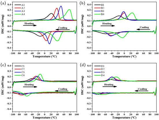 DSC curves of different samples: (a) A1–A4, (b) B1–B4, (c) C1–C4, and (d) D1–D4.