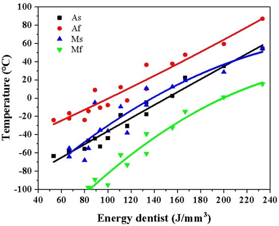 - Shen, F.L.; Li, H.Q.; Guo, H.; Guo, N.N.; Fang, X.Y. Effect of energy density on the superelastic property of Ni-rich NiTi alloy fabricated by laser powder bed fusion. Mater. Sci. Eng. A 2022, 854, 143874. [Google Scholar] [CrossRef]