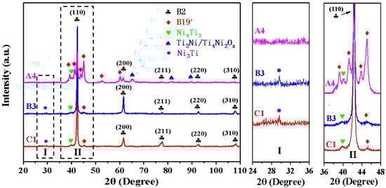 Given the considerable number of samples, C1 (66.7 J/mm3), B3 (133.3 J/mm3), and A4 (233.3 J/mm3) were selected for XRD phase identification, as they were produced using different printing process parameters and exhibited notable differences in superelasticity. This was done with a view to providing further proof of the phase composition of the various NiTi samples at room temperature. Figure 9 illustrates the XRD outcomes of the C1, B3, and A4 samples at room temperature. It can be observed that the diffraction peaks of the C1 and B3 samples predominantly correspond to those of the B2 austenite phase, exhibiting a distinct orientation along the (110) and (200) planes. This indicates that the C1 and B3 samples are primarily in the austenite phase at room temperature, a conclusion that is supported by the DSC results (Figure 7 and Figure 8). It is noteworthy that the diffraction peaks of Ni3Ti and Ni4Ti3 Ni-rich phases were also identified in the C1 and B3 samples. In the case of the A4 sample, the intensity of the diffraction peak associated with the austenite phase is observed to decrease, while a considerable number of B19′ martensite diffraction peaks emerge. This indicates that the A4 sample is a composite phase comprising both austenite and martensite at room temperature, which is also corroborated by the DSC results. It is noteworthy that the Ni3Ti phase was not identified in the A4 sample, but the Ni4T3 Ni-rich phase and the Ti2Ni/Ti4Ni2Ox Ti-rich phase were identified. As Ni3Ti and Ti2Ni/Ti4Ni2Ox do not contribute to superelasticity, they will not be the subject of further detailed discussion in this context.