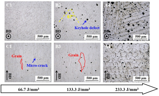 The microstructure is another significant factor influencing the macroscopic properties of NiTi alloys. Similarly, the C1, B3, and A4 samples, which had been printed at different energy densities, were selected for metallographic observation under an optical microscope. Figure 10 depicts the optical microscopic image of the corresponding samples in both the horizontal section (perpendicular to the building direction) and the vertical section (parallel to the building direction). It can be observed that the C1 sample, which was printed with a lower energy density, exhibited minimal hole defects, although some microcracks were present. The B3 and A4 samples, which were printed with a higher energy density, exhibited a considerable number of circular keyhole defects. Furthermore, an increase in energy density was accompanied by a gradual increase in the size and number of pores. The results align with the observed trend of relative density decreasing with energy density, as illustrated in Figure 2b. Additionally, the laser-scanned melting channel and the interlayer rotation angle of 67° are clearly discernible in the horizontal section. In the vertical section, the columnar crystal grains epitaxially grown along the building direction are evident, and the grain size increases with the increase in energy density.