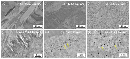 Figure 11 illustrates the SEM micrographs of the C1, B3, and A4 samples in the vertical direction. It is evident that the C1 sample exhibits defects resulting from incomplete fusion, which are reflected in the microcracks observed in Figure 10. Furthermore, the C1 sample displays the presence of columnar crystals aligned in the building direction. No discernible grains were observed in the B3 and A4 samples. However, the A4 sample exhibited the presence of needle-like black stripes. In light of the DSC and XRD results for the A4 sample, which indicated the formation of martensite, it can be postulated that the aforementioned needle-like stripes may be indicative of martensite bands (Figure 11d). It is noteworthy that black nano-precipitates (illustrated by yellow arrows in Figure 11e,f) were observed in the high-resolution SEM images of the C1 and A4 samples. The C1 sample exhibited a relatively higher number of black precipitates with a relatively smaller size, whereas the A4 sample displayed a relatively lower number of black precipitates with a relatively larger size. The XRD results indicate the presence of Ni4Ti3 precipitates in both the C1 and A4 samples, which allows for inferring reasonably that the black precipitate is Ni4Ti3.