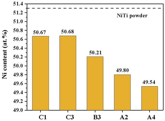 The thermal history of the molten pool of NiTi alloy varies depending on the specific LPBF process parameters employed, as a consequence of the varying degrees of laser energy absorption. This, in turn, gives rise to disparate phase transformation behaviours and microstructures. The phase transformation behaviour of the NiTi alloy is contingent upon the phase transformation temperature, which is markedly influenced by the Ni content. Figure 12 illustrates the Ni content of the C1, C3, B3, A2, and A4 samples, as determined by EDS surface scanning. It can be observed that the Ni content in the samples decreases gradually with an increase in the energy density input. The Ni contents of the C1, C3, and B3 samples were found to be 50.67%, 50.68%, and 50.21%, respectively, indicating that these samples remained Ni-rich. In contrast, the Ni contents of the A2 and A4 samples decreased to 49.80% and 49.54%, respectively, indicating that these samples had undergone a transformation into Ti-rich. This is due to the fact that the evaporation enthalpy and boiling point temperature of Ni element (374.8 kJ/mol, 2913 °C) are smaller than that of Ti element (425.5 kJ/mol, 3287 °C). As the energy density increases, the temperature and size of the molten pool rise, the solidification time lengthens, the selective evaporation loss of Ni is greater, and the ratio of Ni/Ti decreases [26,27]. This results in an elevated phase transition temperature (Figure 8).