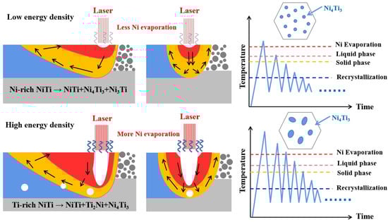 NiTi shape memory alloys have been employed extensively in a range of fields, including solid-state refrigeration, aerospace, biomedical engineering, and beyond, due to their distinctive superelasticity, exemplary elastic thermal properties, corrosion resistance, and biocompatibility [1,2,3,4,5]. In recent years, there has been a notable advancement in the field of additive manufacturing technology. Laser powder bed fusion is a particularly noteworthy technique, whereby powder is melted according to a predetermined path and solidified layer by layer. This method effectively circumvents the difficulties associated with traditional cutting and welding processing when working with NiTi alloys. Furthermore, this method allows for the preparation of NiTi alloys with high quality, excellent mechanical properties, and functional characteristics, which has attracted significant attention in the academic community [6,7,8,9,10]. The superelasticity of the NiTi alloy is derived from the mutual transformation of the internal austenite (B2) and martensite (B19′) phases. The relative ratio of these two phases at room temperature is dependent on the phase transition temperatures (TTs). TTs are highly sensitive to the Ni content, with an increase of 0.1 at.% in Ni content resulting in a decrease of approximately 10 °C in TTs. It can thus be concluded that the Ni content has a significant effect on the superelasticity of the NiTi alloy [11,12,13,14,15]. Furthermore, the evaporation enthalpy and boiling point of Ni (374.8 kJ/mol, 2913 °C) are smaller than those of Ti (425.5 kJ/mol, 3287 °C), resulting in an inherent selective evaporation loss of Ni in LPBFed NiTi. This loss is significantly influenced by process parameters, including laser power, scanning speed, and scanning spacing [16,17,18,19]. In order to regulate the superelasticity of NiTi alloy, it is possible to design the initial chemical composition of the NiTi powder raw materials. This involves using a Ni-rich NiTi powder to compensate for the Ni evaporation loss that occurs during the LPBF process. This results in a lower phase transition temperature for the NiTi alloy, which in turn achieves better superelasticity without the need for heat treatment [20]. Alternatively, the LPBF process parameters can be finely modified, such as the adoption of low energy density to curtail the evaporation loss of Ni, regulate the microstructure, and consequently enhance the superelasticity [21].