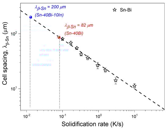 β-Sn cell spacing as a function of the solidification cooling rate; blue and red points for the Sn-40%Bi-10%In and Sn-40%Bi alloys, respectively, were obtained through extrapolation of the experimental equation for the Sn-Bi alloy demonstrated by Silva et al. Dashed line from ref. [22].