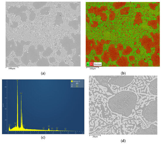 Figure 4 shows the EDS mapping generated for the binary Sn-Bi alloy. As largely reported in the specialized literature [23,24,25], a quasi-regular structure with some degeneration at the boundaries of the eutectic grains can be seen in Figure 4a,b. The binary alloy exhibited a more refined eutectic microstructure, with lamellae rich in Sn (red) and others rich in Bi (green), without presenting a uniform pattern within the structure. One of the EDS spectra, exemplified in Figure 4, roughly confirms the alloy’s composition. Moreover, the samples without In exhibit smaller Bi precipitates, but a higher fraction of Bi (see Figure 3a and Figure 4d). After analyzing several frames by using image J segmentation, In addition promoted an increase in the Bi precipitate size from 0.6 μm2 to 1.9 μm2. Indium appears to hinder the mobility of Bi in the solution, retaining atoms of this element in the Sn-rich matrix, which do not become nucleation sites [26,27,28]. Moreover, the Sn-Bi sample exhibited regions with elongated plates, resulting from facilitated diffusion in the absence of In. In contrast, a mixture of Bi precipitation globules and short plates can be seen in Figure 3a in the Sn-Bi-In alloy.