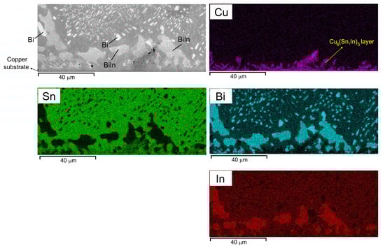 Figure 6 shows the Sn, Cu, Bi, and In maps of regions containing the interfacial Cu6Sn5 in Sn-40%Bi-10%In/Cu. It can be clearly observed that the Cu and Sn distributions are associated with the interfacial IMC layer at the very bottom of the images. Figure 6 shows the phases formed in the alloy and at the interface, as well as the distribution of the elements. The Cu6Sn5 IMC presented a mean solubility of In, approximately 6.5 at.%, as presently determined using point EDS. This value is close to that reported by Tian et al. [33] for the Sn-0.7Cu-5In/copper alloy joints, which was 4.9 at.%. Overall, the composition of this IMC was determined to be 46.5 at.% Sn, 6.5 at.% In, and 47 at.% Cu. This IMC layer is nucleated at the interface because Cu atoms react with the molten solders during the soldering process. Fluxes of tin, copper, and indium atoms also helped the nucleation of Cu6(Sn,In)5; in this condition, these atoms were approached from the solder alloy and the substrate. The size of the IMC is a diffusion-controlled process [34].