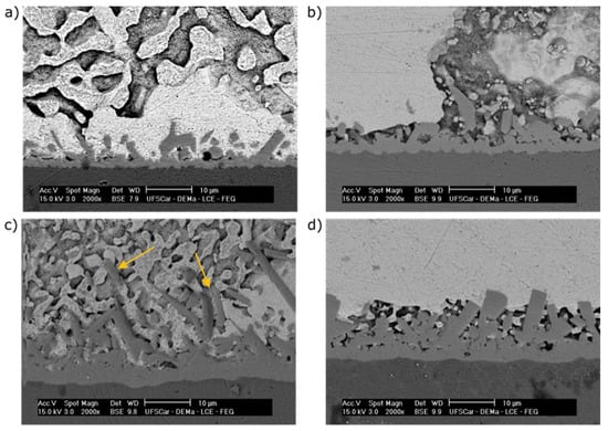 Although copper has higher thermal conductivity than nickel [51], and both substrates showed very similar wettability when compared (see Figure 5), voids were detected at the alloy’s boundaries for the copper substrate (blue arrows in Figure 10) but not for the nickel substrate. According to Soares et al. [39], these voids counteract the high thermal conductivity of copper so that overall heat flow decreased. As such, a coarser eutectic was formed in the alloy solidified in copper (Figure 10a).
