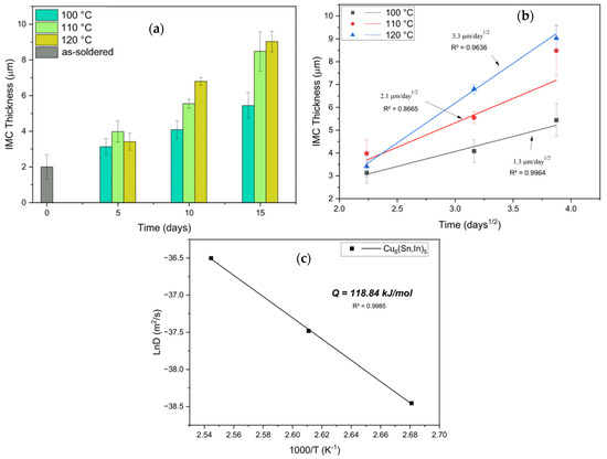 The development of the IMC’s layer was examined as a function of time, as can be seen in Figure 8a. The kinetics of the IMC layer’s growth is consistently governed by volume diffusion, meaning that the growth rate is always proportional to the time (t). The layer thickness, X, is described by the following equation (Equation (1)):