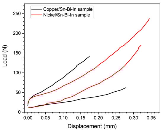 Mechanical strength tests were conducted to understand the ability of the joints to withstand mechanical stresses in both nickel and copper substrates. Figure 9 shows the graphs of the tensile tests performed in the solder joints, showing the relationships between load × displacement capacities for the Sn-Bi-In/Ni and the Sn-Bi-In/Cu couples.