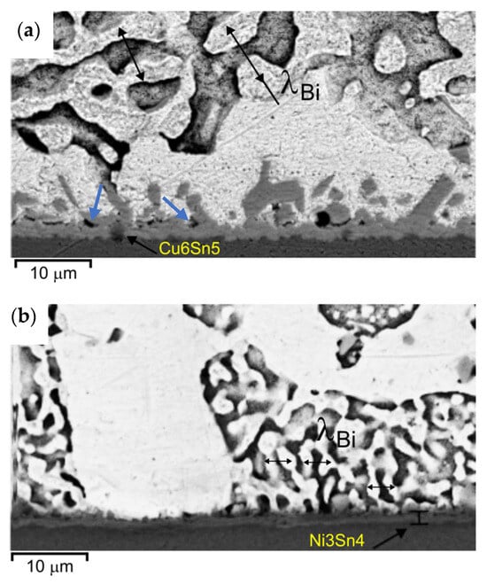 In addition to the formation of a thinner and less tortuous Ni3Sn4 IMC (Figure 10b), the Sn + Bi eutectic developed to be significantly thinner in the case of the nickel, as seen in Figure 10. The λBi measurements showed a spacing at least three times smaller for the alloy solidified in nickel. This indicates a fast cooling associated with nickel. Moreover, finer Bi may induce higher joint strength.