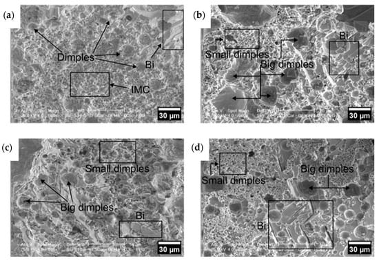 A typical ductile fracture morphology can be observed, characterized by the predominance of small and big dimples (indicated by arrows in Figure 11), with the larger dimples formed by the coalescence of smaller ones. The phases present at the fracture’s interface were also confirmed, particularly the Bi, the Cu6(Sn,In)5, and Ni3Sn4 IMCs. Some cleavage planes, likely originated from the brittle Bi phase, were also observed. In the case of the alloy/copper joint in the IMC fracture plane (Figure 11b,d), the dimples were notably larger, which might have led to premature failure.