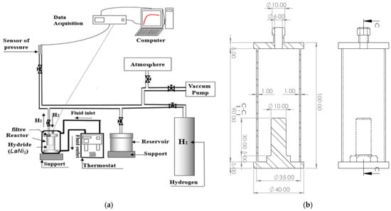The experimental device used is a Sievert apparatus (Figure 1a). It consists of a cylindrical metal hydride reactor M-H-R (Figure 1b) equipped with internal radial fins and connected to a gaseous hydrogen line via connection valves. A cold water bath is used to feed the hydride bed with cooling water during the absorption reaction through a helical heat exchanger. The reactor was filled with 30 g of purchased metal. A pressure sensor is installed between the reactor and the hydrogen tank, controlling the variation in hydrogen pressure during absorption processes. As well, a thermocouple is installed inside the reactor, controlling the internal temperature during absorption. These sensors are installed on an acquisition card and a microcomputer [].