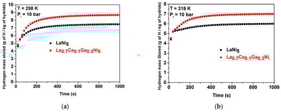 Hydrogen absorption reaction kinetics refers to the rate at which hydrogen is absorbed by a material. Therefore, the task at hand is to depict how the mass of hydrogen absorbed changes over time. Figure 2 presents the variation of the mass of hydrogen absorbed as a function of time at T = 298 K and at T = 318 K for the LaNi5 and the La0.7Ce0.1Ga0.3Ni5 compounds.