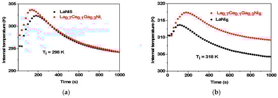 Evolution of the internal temperature for Ti = 298 K (a) and Ti = 318 K (b).