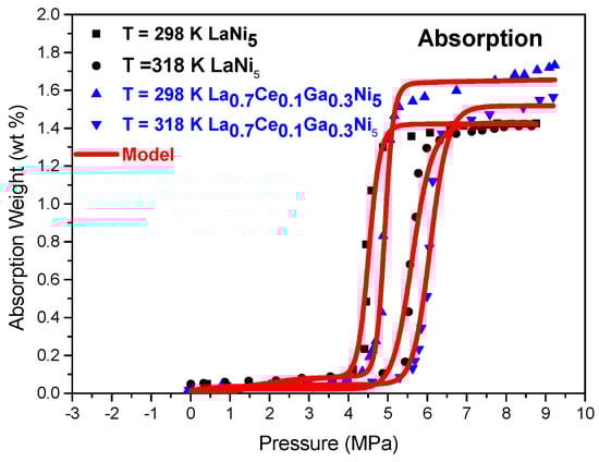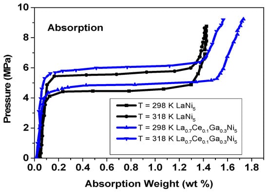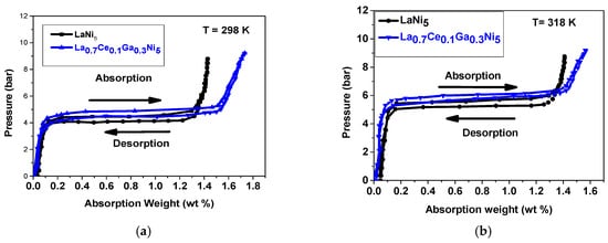Pressure-composition isotherms (P-C-T) are one of the most significant considerations to assess thermodynamic properties for an alloy that absorbs hydrogen. It is feasible to track the development of the reversible storage reaction (absorption/desorption) thanks to these isotherms. The hydrogen absorption isotherms for the compounds LaNi5 and La0.7Ce0.1Ga0.3Ni5 at T = 298 K and T = 318 K are displayed in Figure 4.