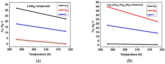 First, it is demonstrated that for both the parent (LaNi5) and doped (La0.7Ce0.1Ga0.3Ni5) compounds, n1 and n2 drop as temperature rises. As a result, n (=) decreases. This is explained by the exothermic nature of the hydrogen absorption process. Thus, the interstitial sites are blocked by the rise in temperature. Subsequently, the results indicated that, in the case of LaNi5, at a given temperature, n1 > n2. This indicates that more hydrogen atoms are being taken up by n1-type sites in the case of LaNi5. Moreover, n2 takes values close to 1. However, n1 takes values much greater than 1. This means that the phenomenon of the agglomeration of hydrogen atoms is more important at the n1 sites than n2. On the other hand, in the case of the La0.7Ce0.1Ga0.3Ni5 compound, the results indicated that n2 > n1. This indicates that n2-type sites are activated, and n1-type sites are blocked by Ce and Ga doping on the La sites. Furthermore, the fact that n1 takes values close to 1 while n2 takes values much higher than 1 indicates that the agglomeration phenomenon originates at n2 sites in the case of the doped compound. In addition, we notice that, at a given temperature, n takes on larger values in the case of the La0.7Ce0.1Ga0.3Ni5 compound than the LaNi5 compound. This means that the average number of hydrogen atoms absorbed at the La0.7Ce0.1Ga0.3Ni5 sites is greater than that absorbed at the LaNi5 sites. This gives a good explanation of the experimental findings. As previously noted, Figure 4 illustrates that the mass percentage of hydrogen stored is higher in the case of the La0.7Ce0.1Ga0.3Ni5 compound than the percentage of hydrogen stored in the case of the LaNi5 compound.