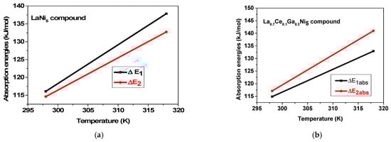 The absorption energy values show that the bond between the hydrogen atoms and the intermetallics is of a chemical type. This implies that the bond formed between the hydrogen atoms and the interstitial sites (n1 and n2) of the intermetallics considered is relatively strong. It is observed that if the temperature increases, the absorption energy also increases. This suggests that higher temperatures require more energy due to the exothermic nature of the absorption reaction. Additionally, it is noted that the doped compound’s absorption energies are somewhat higher than those of LaNi5. This means that the amount of hydrogen stored in the doped compound is slightly greater than that stored in LaNi5, leading to a slightly higher energy expenditure. In addition, it is demonstrated that for the LaNi5 compound, ∆E1 > ∆E2, while for the La0.7Ce0.1Ga0.3Ni5 molecule, ∆E2 > ∆E1. This is explained by the fact that, as shown in Figure 8, the n1 sites are more occupied by hydrogen atoms in the case of LaNi5, whereas the n2 sites are more occupied in the case of La0.7Ce0.1Ga0.3Ni5.