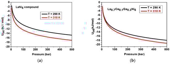 Internal energy versus pressure when T = 298 K and T = 318 K for the LaNi5 (a) and La0.7 Ce0.1Ga0.3Ni5 (b) compounds.
