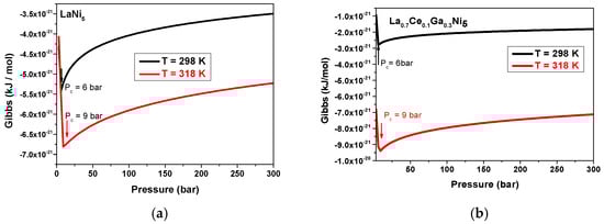 First, we observe that, for a given temperature and pressure, the Gibbs energy takes negative values. This is a blatant sign that the intermetallics’ spontaneous and thermodynamically advantageous process of absorbing hydrogen is occurring. This means that the system will naturally evolve toward this state, often by releasing energy. Next, it is demonstrated that, up to a critical pressure, Pc, the absolute value of the Gibbs energy declines logarithmically as a function of pressure before rising and stabilizing. Pc corresponds to the establishment of thermodynamic equilibrium. This means that beyond Pc, the difference in chemical potential between the gaseous hydrogen and the absorbed hydrogen reaches equilibrium, where the absorption rate becomes zero. Then, the absorption of hydrogen stops, regardless of the increase in pressure. This pressure typically indicates that the material is getting close to its maximum absorption capacity and is discovered when the PCT curve starts to increase quickly after the plateau (Peq). According to the experimental results (Figure 5), we see that this pressure varies between 6 bar and 9 bar, which confirms the results of our model. At a given temperature, it is observed that Pc is the same for both compounds. This means that they start to absorb at the same pressure. This is because the energy required for hydrogen to insert into the interstitial sites is similar for both compounds, resulting in identical absorption pressures.