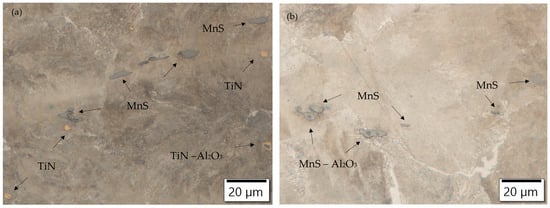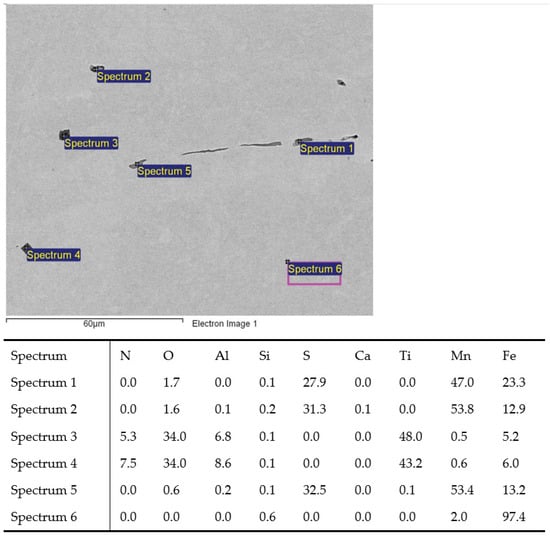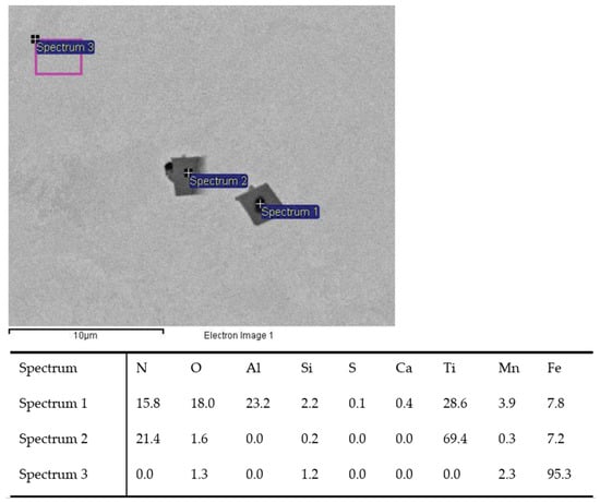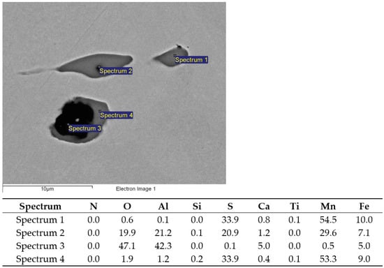 The emerging inclusions in the researched type of low-alloy steel are primarily oxide inclusions of the ternary system MnO–SiO2–Al2O3. As a result of titanium alloying, in addition to TiN, complex binary inclusions of TiOx–Al2O3 with the presence of a MnO or SiO2 phase are formed. Titanium inclusions are formed, which can be pure nitride, pure oxide, or multiphase, consisting of nitride, sulfide, or oxide phases (TiN, (Ti, Al, O), MnS) [41]. Many mixed oxide-based nitride inclusions (Al2O3) are present in the manufactured charges (T1–T4), Figure 3. Titanium also affects the sulfide inclusions and the formation of two-phase inclusions composed of MnS and TiN, as shown in Figure 4. By increasing the addition of titanium, the proportion of titanium increases in the nitride, oxide, and sulfide inclusions [20].