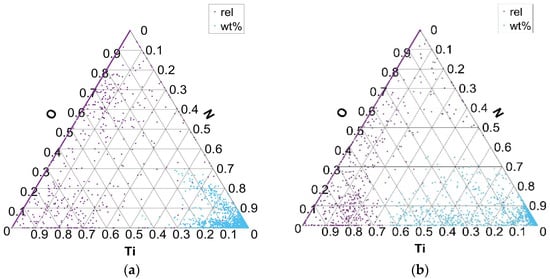 Figure 6 shows the distribution of the formed phases in the Ti–N–O ternary diagram for charges with added Ti (T1 with 0.018% Ti and T4 with 0.059% Ti). TiO and TiN inclusions are formed as part of the distribution of Ti, N, and O elements. The distribution of the formed phases between the Ti, N, and O elements, according to the composition of all analyzed inclusions, shows that inclusions are mainly formed in the corner of the N–Ti binary diagram. At higher Ti contents, the fraction of Ti in the TiN inclusions increases. In the charges where Ti was not added and its proportion in the steel is negligible (S1–S4), phases are formed in the area of the binary diagram O–N.