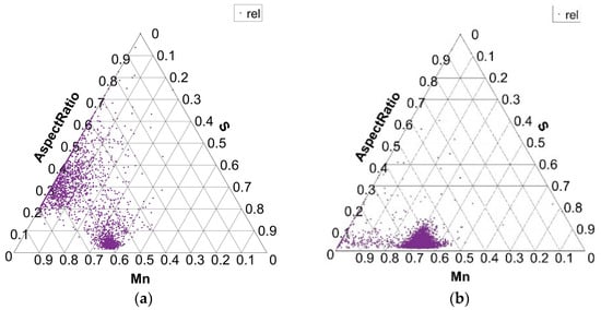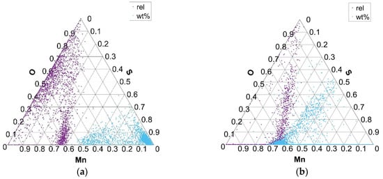 Ternary plots, presented in Figure 6, Figure 7, Figure 8 and Figure 9, show two points per single non-metallic inclusion, labeled as “rel” and “wt%”. The “rel” points are calculated in the established way of normalization (or relativization) such that for every row (A, B, C), the sum of all three components A + B + C is 1 (or 100%). This is calculated by the formula Arel = A × 100/(A + B + C) and in the same way for Brel and Crel. The calculation of points under “wt%” labels is performed simply by Awt% = A/100; Bwt% = B/100; and Cwt% = C/100. This is only possible since the chemical composition of each non-metallic inclusion for each component is inherently between 0 and 1 (0 and 100%). Awt% is thus actually the weight percent of component A in the analyzed non-metallic inclusion. The new “wt%” calculated and plotted ternary plots seem to be more intuitive and informative when used combined with established normalized (relative) ternary plots. It is worth noting that generally for some components of ternary plot calculation in form Awt% = A/100, it is not possible if the component is not inherently between 0 and 100%. It is, however, possible to normalize only a single component of the ternary plot to some (e.g., max) value of a given component distribution. In the case of non-metallic inclusions, one such component is inclusion area, where the upper bound of the component is generally not between 0 and 1.