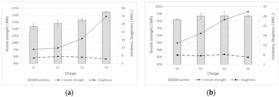 Mechanical properties (hardness, tensile strength, and toughness) for charges of steels (a) T1–T4, and (b) S1–S4.