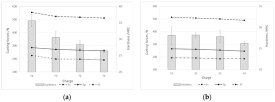 Cutting forces during rough turning depending on the hardness of the produced charges of steel; (a) charges with higher % Ti and (b) charges with higher % S and Al.