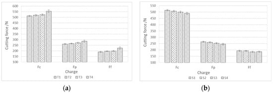 Components of cutting forces (Fc, Ff, Fp) during rough turning of bars made from charge steels; (a) with a higher proportion of Ti and (b) with a higher proportion of Al, Ca, and S.
