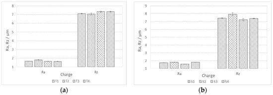 Mean profile deviation (Ra) and mean height of unevenness (Rz) of bar surface during fine turning; (a) charges with higher %Ti and (b) charges with higher %S.