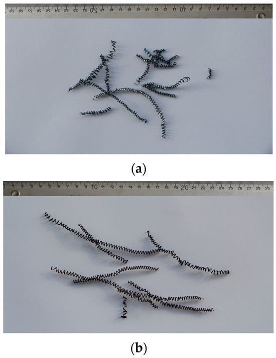 In addition to the lower values of the cutting forces, the better machinability of the steels is also manifested in lower roughness or finer surface qualities. The achieved values of the mean height of the unevenness of the roughness profile Rz and the mean arithmetic deviation of the profile Ra during fine turning of bars are shown in Figure 14. We can see that in charges with a higher proportion of Ti, the value of Ra is in the range of 1.5 m and the value of Rz is in the range of 7 m (Figure 14a). The Ra value decreases with increasing Ti content, which is typical for steels with increased hardness and lower toughness, and the formation of short spiral chips (Figure 15a). The exception is charge T2 with the highest toughness, which prevents normal chip breaking and fine processing. Rz increases with an increase in the proportion of Ti, and with such a larger proportion of TiN inclusions, these can be torn out of the surface during cutting. In charges with a higher proportion of Al, Ca, and S, the roughness values are higher (Ra = 1.5–2.0 m and Rz = 7.5–8.0 m), which is the result of softer and tougher material and the formation of long spiral shavings (Figure 15b). Significant differences in surface roughness cannot be observed between charges with different S content, also due to the scatter of the measurement results (Figure 14b).