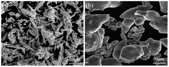 The Cu–Al alloys were prepared using Cu powder and Al powder with a purity of 99.9%, which were produced by the Zhongzhou Alloy Material Co., Ltd. (Shanghai, China). A scanning electron microscope (SEM) was used to index the microstructure of the Cu–Al powder, and the micromorphology of the Cu powder and Al powder is shown in Figure 1. The chemical composition of the Cu powder and Al powder is displayed in Table 1.
