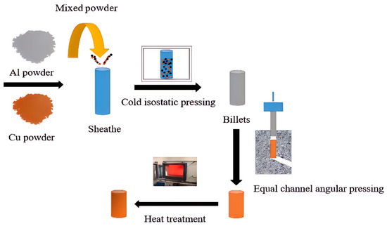 The extruded samples were kept in the GSL-1500X-OTF (Hefei, China) at 500 °C for 2 h, and were protected by the N2. The preparation process of the Cu–Al alloys is summarized in Figure 2.