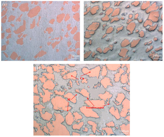 With the Cu–Al volume ratios increasing from 1:2 to 2:1, both the number and size of the Cu phase significantly increased. Due to the extrusion between Cu and Al, more metal compounds were generated, and the transition region showed an increasing trend.