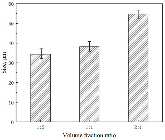 The average size of the aggregate Cu phase in Cu–Al alloys at different volume ratios is shown in Figure 5. As shown in Figure 5, the average size of the Cu phase in the Cu–Al alloys with a Cu–Al volume ratio of 1:2 was 35 μm. With the Cu–Al volume ratios increasing to 1:1, the average size increased to 38 μm. The average size of the Cu phase significantly increased when the Cu–Al volume fraction ratio increased to 2:1. In addition, the aspect ratio of the Cu phase in Cu–Al alloys at different volume ratios was also quantitatively analyzed by the IPP software.