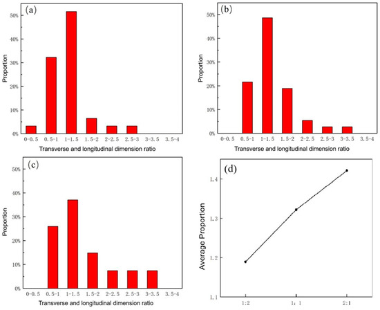Statistical analysis of the aspect ratio of the Cu phase in Cu–Al alloys at different volume ratios ((a) 1:2, (b) 1:1, and (c) 2:1) and the plot of average transverse and longitudinal dimension ratios (d).