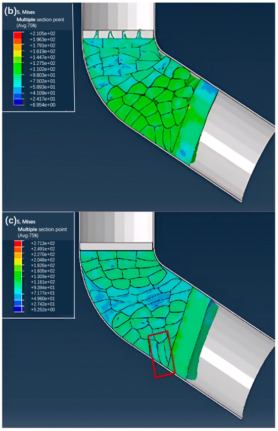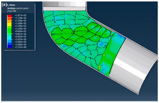 The stress cloud diagram of the equal-channel angular pressing of the Cu and Al powders obtained by post-processing is shown in Figure 10. The semi-section view was used to clearly characterize the deformation of internal particles. As displayed in Figure 10a, the stress was concentrated between the Cu particles, and the maximum stress was 187.7 MPa with a Cu–Al volume ratio of 1:2.