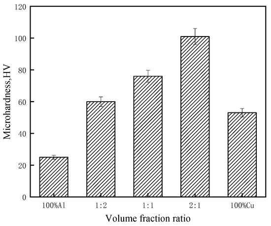 The microhardness of the Cu–Al alloys at different volume ratios is displayed in Figure 11. As shown in Figure 11, the microhardnesses of the Cu–Al alloys with different Cu–Al volume ratios were 60 HV, 76 HV, and 101 HV, respectively. The microhardness value of the materials measured was related to the phase composition of the indenter contact part of the microhardness tester.