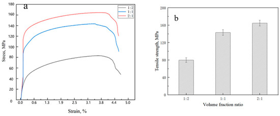The tensile properties of the Cu–Al alloys at different volumes is displayed in Figure 12. The ultimate tensile strength (UTS) of the Cu–Al alloys with a Cu–Al volume ratio of 1:2 was 79.9 MPa. By increasing the Cu–Al volume ratio from 1:1 to 2:1, the UTS of the Cu–Al alloys increased from 143.3 MPa to 164.9 MPa. The influence of the Cu–Al volume ratio on tensile strength is simply described as: