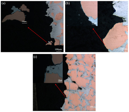 The micrographs of the longitudinal section of the tensile fracture surface of the Cu–Al alloys at different volume ratios are displayed in Figure 13. It was found that the crack initiation occurred at the Cu–Al interface and spread along the bonding surface due to the high hardness and brittleness of the copper–aluminum metal compounds.
