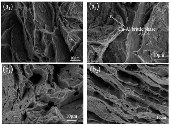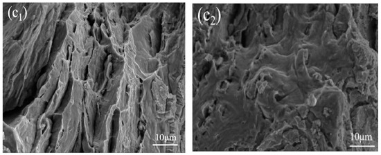 With the increasing particle interface, the fracture surface was in the form of grains in Figure 14b1,b2, which resulted in crack generation. When the volume ratios of the Cu–Al alloys were increased to 2:1 in Figure 14c1,c2, a great number of large tearing edges were distributed in the tensile fracture surface of the Cu–Al alloys, indicating that the dominant fracture mechanism was brittle fractures.
