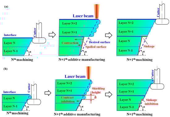 Figure 1 illustrates the mechanistic diagram of sinkage depth generation and inhibition of sinkage depth by adding shielding heights in ASHM. Figure 1a shows the mechanism of sinkage generation during ASHM. The surface of overhanging holes exhibits desired surface with high surface quality after the Nth machining process. Subsequently, the N + 1th additive manufacturing process is started, in which the additive part is heated to a high temperature. When N + 1th additive manufacturing process is completed, the material cools down and the Nth machining surface experiences serious contraction at the interface, resulting in a sinkage. In the N + 1th machining process, the additive part is machined to desired surface. Consequently, sinkage is generated at the alternating interfaces of ASHM. Gao et al. [19] also illustrated that the sinkage during the alternating process was generated by thermal influence. By adding shielding height to separate the desired surface away from the subsequent additive manufacturing, the effect of heat input from additive manufacturing on the desired surface is reduced, and contraction of the desired surface during the alternating process is suppressed, as shown in Figure 1b. Therefore, the sinkage depth is reduced and the surface quality is improved. In this study, four different shielding heights were set: 0 mm, 0.1 mm, 0.3 mm, and 0.5 mm.