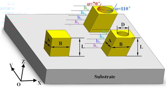 Overhanging features existed in overhanging holes, which are known as undercut in traditional machining [25]. Machine tools limitation make such features difficult to machine, especially on three-axis machines. The overhang angle α value of overhanging holes were selected at 70°, which is between 0° and 90°. A typical feature of overhanging holes produced by ASHM is shown in Figure 2, and the dimension of the overhanging holes is shown in Table 1. As shown in Figure 2, the red part is an overhang surfaces with an angle of 70°, while the blue part is an overhang surface with an angle of 110°. Besides, an overhanging hole is divided into four parts. The values of h1, h2, h3, and h4, represent the shielding heights of 0 mm, 0.1 mm, 0.3 mm, and 0.5 mm, respectively, used in the machining process. Two overhanging holes of different diameters were manufactured to investigate the effect of hole size on the surface quality. The ASHM process is a discontinuous additive process in which the manufactured portion is reduced to a lower temperature during the machining process and then heated to a high temperature when the additive manufacturing is resumed. In order to study the continuity in microstructure at the interface, a 10 × 10 × 10 mm cube (shown in Figure 2) was fabricated along with the overhanging holes to characterize the microstructure of Ti6Al4V alloy fabricated by ASHM.
