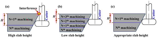 In order to improve the manufacturing efficiency, machining is conducted after several layers of LPBF. The alternation timing between LPBF and machining is particularly important in the ASHM process for components with overhanging features. A high LPBF slab height greatly increases the risk of interference between the cutter and manufactured workpiece in the subsequent machining process, as shown in Figure 5a. A low LPBF slab height results in a higher machining frequency, which reduces the manufacturing efficiency, as shown in Figure 5b. Furthermore, a low slab height also increases the number of alternating interfaces, and deteriorates the surface quality of ASHM-manufactured components.