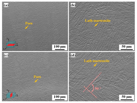 We observed microstructure bonding at the alternation interfaces in ASHM and the microstructure characteristics between the XOY and XOZ planes. The microstructure at the alternation interfaces on the XOZ plane and microstructure on the XOY plane were characterized. The analysis results are shown in Figure 6. No cracks and lack of fusion defects were observed at low magnification (Figure 6a,c). A small number of micro-sized pores existed, which is commonly found in the LPBF additive manufacturing components [27,28]. As shown in Figure 6b,d, fine primary lath martensite was generated in the Ti6Al4V, which was caused by the extremely fast cooling rate during the LPBF process. In addition, this fine lath martensite microstructure existed in two different orientations, showing an angle of 90°, which is consistent with the angle of the scan path between the adjacent layers. This phenomenon is most pronounced in XOZ plane, as shown in Figure 6d, which was caused by the different direction of temperature gradient between the adjacent deposition layers [29]. It was also observed that the fine lath martensite grew much greater than the layer thickness, suggesting the occurrence of the epitaxial growth of martensite. Besides, Figure 6c,d also show the microstructure characteristic at the alternating interfaces of ASHM. It shows a uniform microstructure distribution, indicating that the pause of the additive manufacturing during ASHM does not lead to microstructural debonding. This is due to the fact that in subsequent additive manufacturing, the deposition layer is heated again to a high temperature under the high-energy laser beam.
