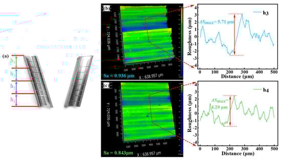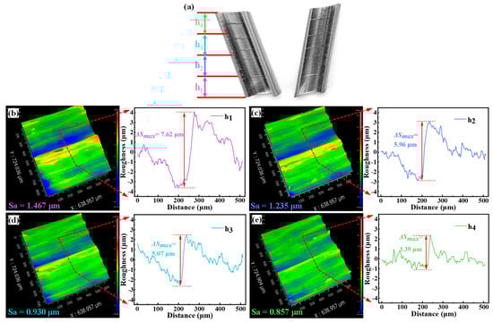 The ASHM-manufactured overhanging holes with a diameter of 8 mm is shown in Figure 7a. Because the similar surface roughness and sinkage depth at the alternation across different heights at the interfaces under the same shielding height, only one set of surface roughness and sinkage depth under this common shielding height is presented. The results of surface roughness and sinkage depth of 8 mm overhanging holes at different shielding heights are shown in Figure 7b–e. ΔSmax is defined as the maximum distance from the peaks to valleys at the alternating interface of AHSM, i.e., the depth of sinkage. It can be found that the maximum value of ΔSmax reached to 7.62 μm when the shielding height is 0 mm (Figure 7b). As the value of shielding height increased, the value of ΔSmax gradually decreased and reached a minimum value of 3.39 μm when the shielding heights was 0.5 mm, as shown in Figure 7e. Simultaneously, the surface roughness of overhanging hole was reduced from Sa 1.467 μm at a shielding height of 0 mm to Sa 0.857 μm at a shielding height of 0.5 mm (Figure 7b,e), showing a reduction in surface roughness of 41.58%. The above results show that the method of adding shielding height at the alternating interface of AHSM can effectively reduce the sinkage depth and improve the surface quality of the overhanging holes.