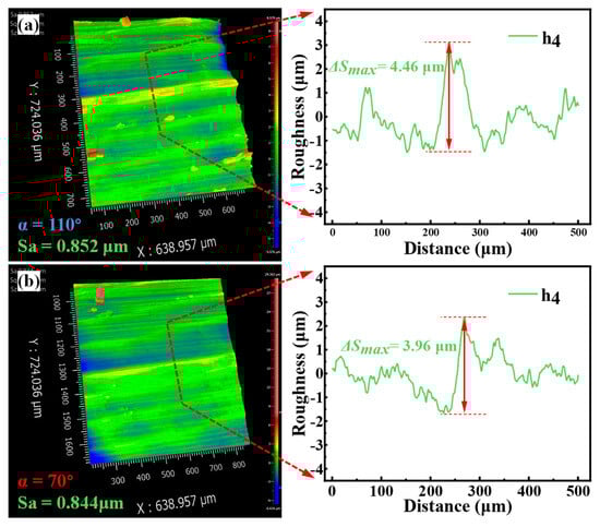 In an overhanging hole, different overhanging angles exist at different locations of the interior surface of the hole. In this study, the range of the overhanging angles α were mainly 70° and 110°. To determine the applicability of the same shielding heights in the same overhanging hole, the surface roughness and sinkage depth for the hole with a diameter of 8 mm were characterized at overhang angle of 70° and 110°, as shown in Figure 9. The surface roughness and sinkage depth ΔSmax at α = 110° and shielding height h = 0.5 mm were shown in Figure 9a. It can be seen that the surface roughness and sinkage depth ΔSmax were Sa 0.852 μm and 4.46 μm, respectively. The surface roughness and sinkage depth ΔSmax at α = 70° and shielding height h = 0.5 mm are shown in Figure 9b. It can be seen that the surface roughness and sinkage depth ΔSmax were Sa 0.844 μm and 3.96 μm, respectively. The similar surface roughness and sinkage depth ΔSmax at the same overhanging holes with different overhang angle α indicate that at the same shielding heights, uniform surface quality of overhanging holes can be obtained.